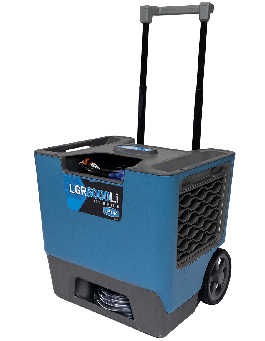 Stack two of the new compact Dri-Eaz LGR 5000 commercial dehumidifiers to roll onto your next water damage restoration job to streamline the load in. With max water removal of 164 pints, the ultra-compact LGR 5000Li portable dehumidifier is the perfect size for most water damage restoration jobs. It's also amazingly quiet, lightweight and draws only 5 amps.